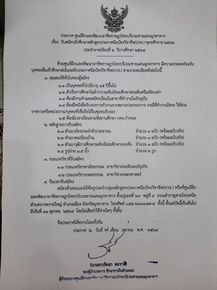 ศูนย์ฝึกและพัฒนาอาชีพราษฎรไทยบริเวณชายแดนมุกดาหาร ขอเชิญชวนทุกท่าน ร่วมลงนามถวายพระพรชัยมงคล เนื่องในโอกาสวันเฉลิมพระชนมพรรษา สมเด็จพระนางเจ้าสุทิดา พัชรสุธาพิมลลักษณ พระบรมราชินี\" ๓ มิถุนายน ๒๕๖๗ ผ่านทางออนไลน์ https://docs.google.com/forms/d/1